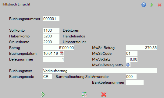 Unter der Voraussetzung, dass in den System-Menu/Einstellungen die Mehrwertsteuersätze und Konten definiert sind, nimmt das Programm die entsprechenden Mehrwertsteuerbuchungen automatisch vor, und zwar mit der im System-Menu/Einstellungen/System-Grundeinstellungen eingestellten Rundungsgenauigkeit.