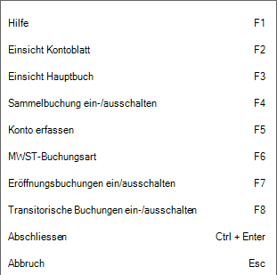 Alle Buchungen, die während dieser Anzeige erfasst werden, kennzeichnet das Programm mit dem Code «NPT», «CHT» oder «CRT» als transitorische Buchungen und nimmt beim Abschluss nimmt das Programm automatisch deren Umkehrbuchungen vor.