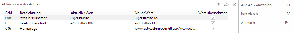 Nun wird angezeigt, welche Felder Unterschiede aufweisen. Mit Hilfe der Spalte 'Wert übernehmen' können die Felder ausgewählt werden, die aktualisiert werden sollen.