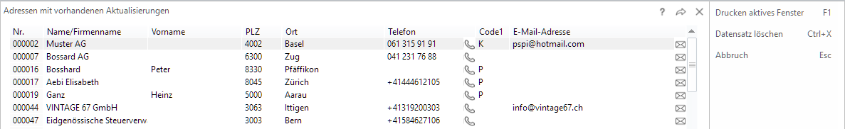 Wurden Adressen gefunden, die aktualisiert werden können, werden diese in einer Übersicht angezeigt. Mit 'Enter' kann nun die ausgewählte Adresse aktualisiert werden.