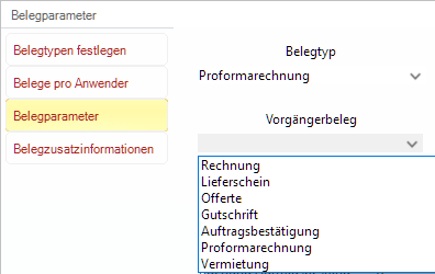 Für jeden Belegtyp sind die Belegparameter festzulegen. Die Auswahl des Belegtyps erfolgt mit Funktionstaste 'F1'.