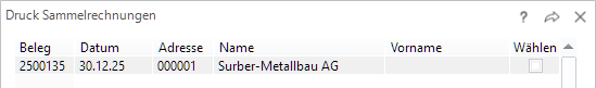 Hier können Sie ausgewählte Sammelrechnungen des gewählten Generierungslaufes drucken. Es erscheint ein Fenster zur Markierung der zu druckenden Sammelrechnungen.