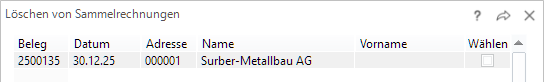 Ausgewählte Sammelrechnungen des Generierungslaufes können gelöscht werden. Es erscheint ein Fenster zur Markierung der zu löschenden Sammelrechnungen.