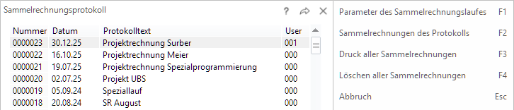 Mit der Funktionstaste 'F2' in der Protokollübersicht kommen Sie zur Übersicht der Sammelrechnungen eines Protokolles.
