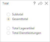 Mit Hilfe dieser Funktion kann an jeder beliebigen Stelle eines Belegs eine Zwischensumme (Subtotal) oder eine Gesamtsumme (Total) in der Betragsspalte gebildet werden. Die Funktion ist nur in einer Leerzeile ausführbar.