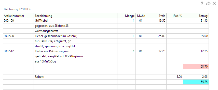 Ein Total kann auch pro Artikel und pro Dienstleistung gebildet werden, um Artikel und Dienstleistung gesondert ausweisen zu können. Beachten Sie, dass durch die Subtotale ein Block festgelegt wird, der für die Bildung von Blockrabatt benötigt wird, d.h. Sie sollten vor der Festlegung eines Blockrabattes im Beleg alle Subtotale bilden.