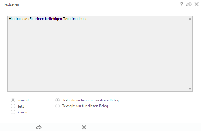 Der Text wird nach Verlassen des Fenster an die entsprechende Position im Beleg eingefügt. Hierzu wird der Text automatisch entsprechend Zeilenlänge umgebrochen. Wenn Sie einen Zeilenumbruch fest definieren wollen, dann geben Sie in der Textbox an der entsprechenden Stelle die Tastenkombination 'Shift+Enter' ein. Beim Einfügen des Textes werden nachfolgende Belegzeilen automatisch nach hinten verschoben. In dem Fenster können Sie auch noch die Schriftart und den Gültigkeitsbereich der Textzeilen bestimmen.