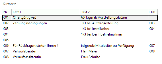 Strukturierte Kurztexte bestehen standardmässig aus zwei Spalten. Diese sind in den Grunddaten vorzuerfassen. Nach Wahl des Texttypes werden die strukturierte Kurztexte zur Wahl des Textes angezeigt.