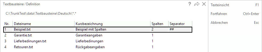 Im Kopf der Texteinsicht steht der vollständige Dateiname des Textbausteins. Bestätigen Sie den Text mit der Eingabetaste 'Enter', dann wird der Textbaustein in den Beleg eingefügt und Sie stehen wieder im Beleg nach dem Text des Textbausteins. Mit der Escape-Taste 'ESC' können Sie bei der Einsicht die Wahl verwerfen und Sie stehen wieder im Verzeichnis der Textbausteine für eine erneute Wahl eines Textbausteines oder dem Abbruch des Vorganges mit der Escape-Taste 'ESC'. Beachten Sie, dass die Verwaltung der Textbausteine sprachunabhängig ist. Arbeiten Sie mit mehreren Sprachen bei den Belegen, dann sollten Sie für jede Sprache ein gesondertes Unterverzeichnis für die Textbausteine anlegen und die Dateinamen für alle drei Sprachen gleich wählen, um eine einfache Auswahl zu ermöglichen.