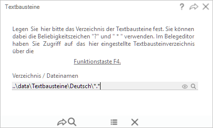 Längere Textpassagen sind statt in Kurztexten besser in Textbausteinen zu erfassen. Textbausteine sind sequentielle Dateien, die mit einem beliebigen Texteditor erfasst worden sind. Die Länge einer Zeile darf die maximale Länge der Textzeile (abhängig von Parametrierung, maximal 110 Zeichen) nicht überschreiten. Diese Dateien werden nach Anwahl ohne Veränderung in den Beleg eingefügt. Textbausteine können sprachabhängig geführt werden. Nach Anwahl erscheint das Fenster zur Auswahl oder Bestätigung des Verzeichnisses mit den Textbausteinen.