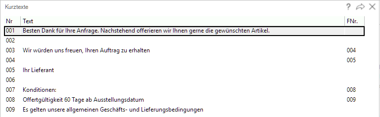 Positionieren Sie sich mit den Cursortasten auf die erste einzufügende Textzeile. Mit der Eingabetaste 'Enter' bestätigen Sie Ihre Wahl und der Text beginnend ab der gewählten Position wird in den Beleg eingefügt. Die Einfügung endet mit einer Zeile ohne Folgenummer. Wenn Sie keinen Text wählen wollen, dann drücken Sie Escape-Taste 'ESC'. Das Anzeigefenster mit den Kurztexten verschwindet automatisch.