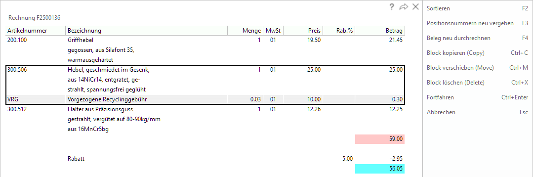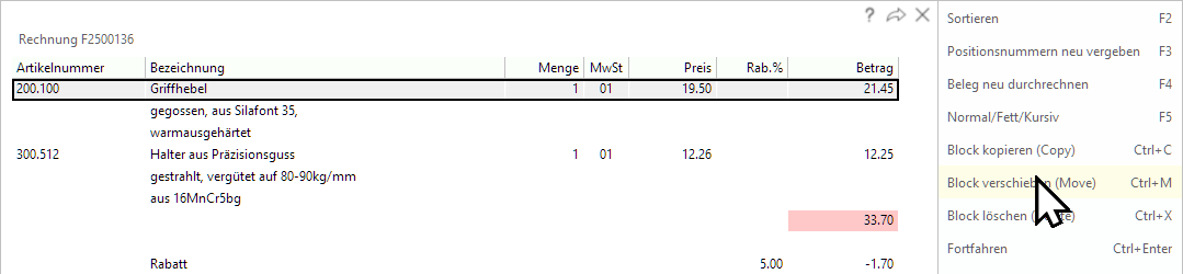 Wenn Sie auf einem Artikel stehen und dieser mehrere Folgezeilen hat, die zu dem Artikel gehören, wird der gesamte Block markiert, indem Sie einfach auf Ctrl+C, M oder X klicken. Achtung, mit X wird der Block sofort gelöscht.