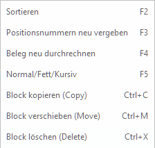 Wenn Sie den Block löschen wollen, dann wird die Funktion sofort nach ihrer Wahl ausgeführt. Im Fall von 'Block verschieben' und 'Block kopieren' müssen Sie als nächstes die Einfügeposition mittels der Cursortasten im Beleg bestimmen. Mit der Eingabetaste 'Enter' bestätigen Sie die Position und die Funktion wird ausgeführt. Enstehende überflüssige Subtotals werden automatisch gelöscht.
