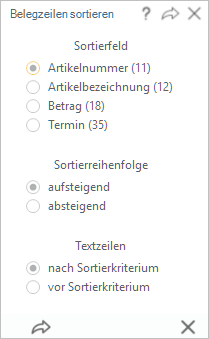 Die Belegzeilen können nach einem Sortierkriterium (Feld der Belegzeile) aufsteigend oder fallend sortiert werden. Die entsprechende Information legen Sie im nachfolgenden Fenster fest.
