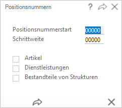 | Positionsnummernstart: | Erste zu vergebende Positionsnummer (Startwert). |