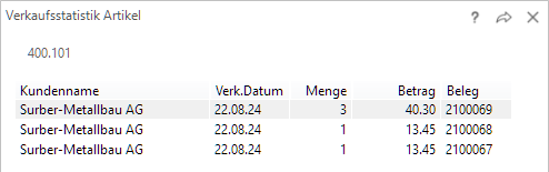 Die Verkaufsbewegungen für den aktiven Artikel und diesen Kunden.