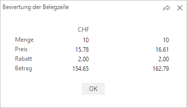 Wenn im Mandanten eine Bewertungswährung definiert ist, wird hier für die aktive Zeile der Wert in dieser Währung angezeigt.