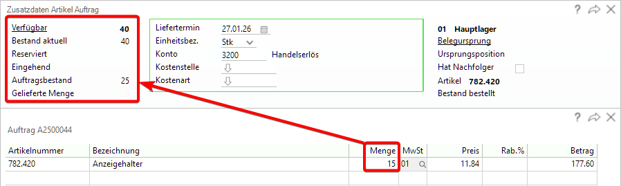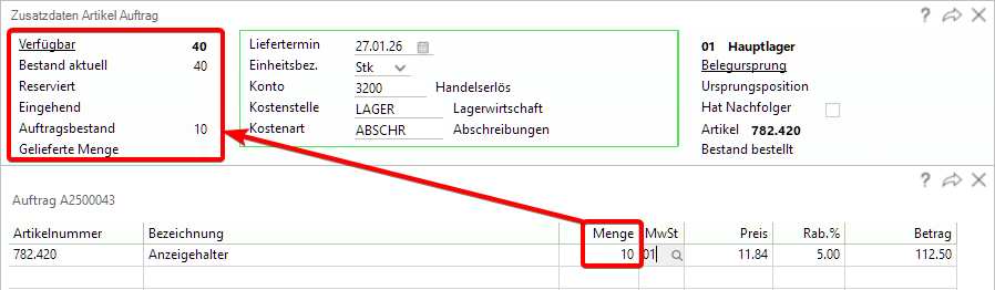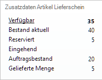 Reserviert und Verfügbar werden in Echtzeit angezeigt, eine Änderung der Menge im Editor wird sofort in den Zusatzdaten angepasst. Verfügbar = Bestand aktuell - Reserviert.