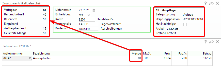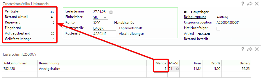 Obwohl der Lieferschein noch nicht abgebucht wurde, werden die gelieferte Menge und der Auftragsbestand ebenfalls provisorisch geschrieben.