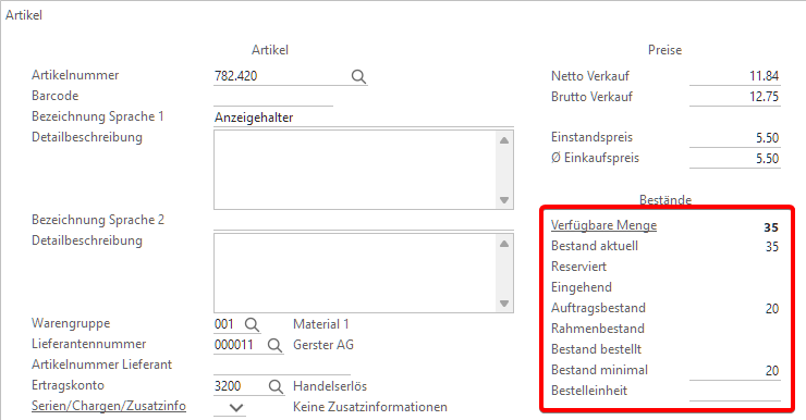 Mit dem neuen Editor wurden parallel zum eigentlichen Bestand Reservationen eingeführt. Was bedeutet, dass, solange ein Beleg nicht abgebucht wird, die Menge noch nicht vom tatsächlichen Bestand abgezogen wird. Das neue Feld "Verfügbar" zeigt den Bestand minus Reservierungen an