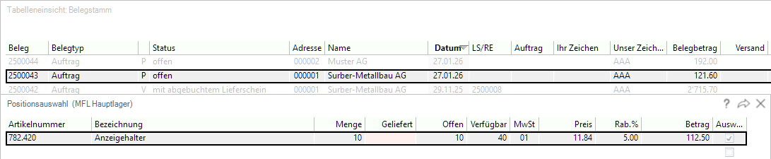 Wenn der nächste Lieferschein für diesen Auftrag erstellt wird, wird die gelieferte und noch offene Menge entsprechend im Fenster Positionsauswahl angezeigt.