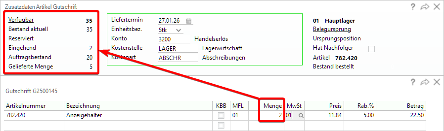 Wenn eine Gutschrift erstellt wird, wird Reserviert in eingetragen. Dies wird in Verfügbar nicht berücksichtigt.