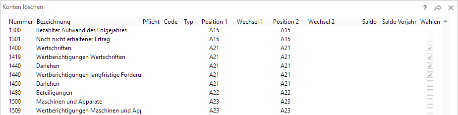 Im Gegensatz zum vorherigen Punkt können hier mehrere Konten auf einmal gelöscht werden. Ansonsten gelten die gleichen Regeln. Die Löschungen sind in beiden Geschäftsjahren wirksam.
