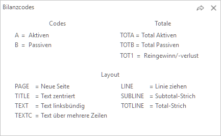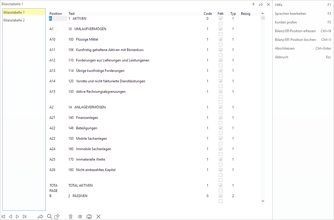 Das Betätigen der Funktionstaste 'F1' zeigt die standardmässig zur Verfügung stehenden Codes für die Bilanztabellen. Weitere Codes können frei definiert werden.