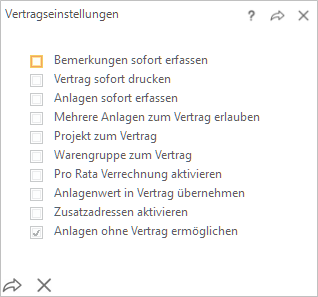 Anlagen sofort erfassen: Sie können zu einem Vertrag die Anlagen unmittelbar nach der Erfassung der Vertragsdaten erfassen, wenn diese Einstellung aktiviert ist. Sonst sind die Anlagen zu einem Vertrag über einen gesonderten Menupunkt zu definieren.