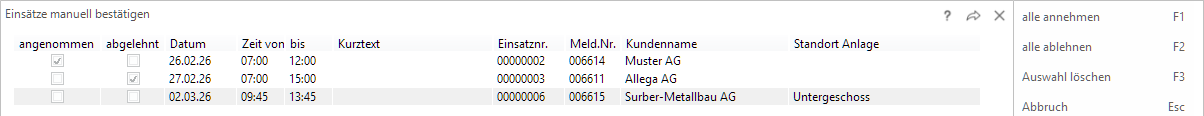 Durch mehrmaliges Drücken der Leertaste wechseln Sie zwischen angenommen und abgelehnt. Im Einsätze planen wechselt ein angenommener Einsatz auf gelb, ein abgelehnter Einsatz auf rot. Abgelehnte Einsätze müssen neu disponiert werden. Verwenden Sie Funktionstasten für eine beschleunigte Verarbeitung: