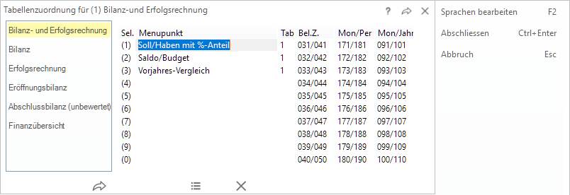 | Tab: | Tabellennummer der Auswertungstabelle von Bilanz resp. Erfolgsrechnung. Standardmässig sind zwei Tabellen aktiviert, maximal können zehn parametriert werden. |