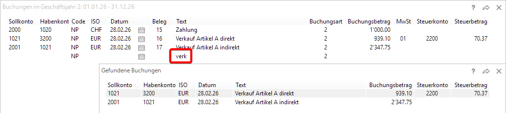 | Buchungsvorschlag anhand von Buchungstexte: | Wenn aktiviert, springt der Cursor im Hilfsbuch auf das Textfeld und nachdem Sie einen Text oder einen Teil davon eingegeben und die Eingabetaste gedrückt haben, erscheint ein Fenster mit identischen Texten, die Sie auswählen können und das Programm übernimmt die gesamte Zeile.![]() ![]() |