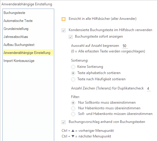| Kondensierte Buchungstexte im Hilfsbuch ... | Ja = Über die F2-Taste können schon eingegebene Buchungstexte eingesehen werden. Nein = Die F2-Taste kann zum Einfügen des definierten Textes verwendet werden. |