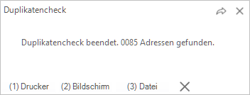 - Anschliessend kann angegeben werden, wohin die Liste mit den gefundenen Duplikaten ausgegeben werden soll (Drucker, Bildschirm, Datei).