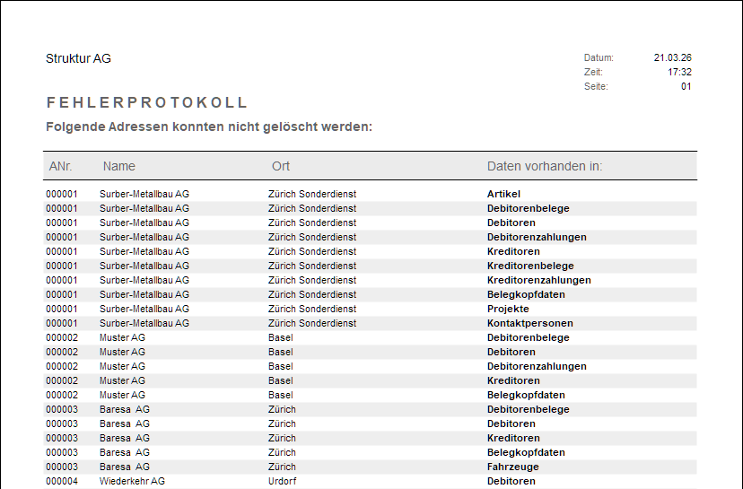 Falls die CheckBox Nicht gelöschte Adressen anzeigen? aktiviert wurde, erhalten Sie eine Liste mit den geforderten Daten: