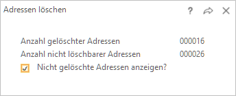 Konnten einige Adressen, die das Selektionskriterium erfüllen, nicht gelöscht werden, weil ihnen in anderen Programmen Daten zugeordnet sind, erscheint:
