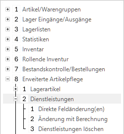 Unter diesem Punkt können die Dienstleistungsdaten sehr rasch an neue Gegebenheiten angepasst werden. Diese Massendatenpflege eignet sich besonders bei grossen Dienstleistungsbeständen zur globalen und effizienten Wartung dieser Datenbanktabellen.