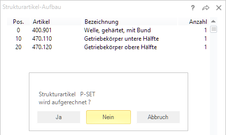 (2) Nach Selektion über Artikel werden für alle zutreffenden Strukturartikel die unter Formeldefinition beschriebenen Felder neu aufgerechnet.
