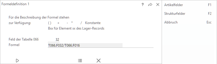 (1) Nach Aufruf eines Strukturartikels werden alle unter Formeldefinition beschriebenen Felder neu aufgerechnet.
