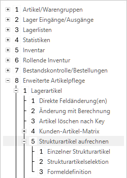 Dieser Punkt dient der automatischen Berechnung von Strukturartikeln. Pro Datensatz können bis zu fünf Felder mit frei definierbaren Formeln berechnet werden.