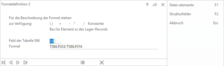 Formel: T066.F033/T066.F016 Bewirkt, dass im Feld Bruttoverkaufspreis des Strukturartikels die Summe aller Bruttoverkaufspreise, dividiert durch die Anzahl pro Preis, der Bestandteile gebildet wird.