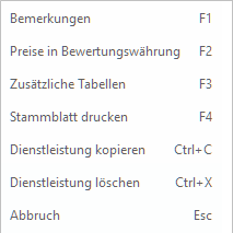 F4: Ermöglicht nach der Wahl des Ausgabegeräts die Ausgabe des Stammblatts für die aktuell gewählte Dienstleistung. Das Stammblatt kann alle Dienstleistungsfelder und Bemerkungen enthalten.