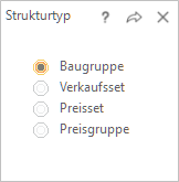 Durch die Anwahl des Types Baugruppe wird der eben erfasste Strukturartikel als eine Baugruppe gespeichert. Diese kann nur als ganzes verkauft werden, d.h. einzelne Teile können nicht ausgetauscht werden. Eine Baugruppe hat einen eigenen Preis.